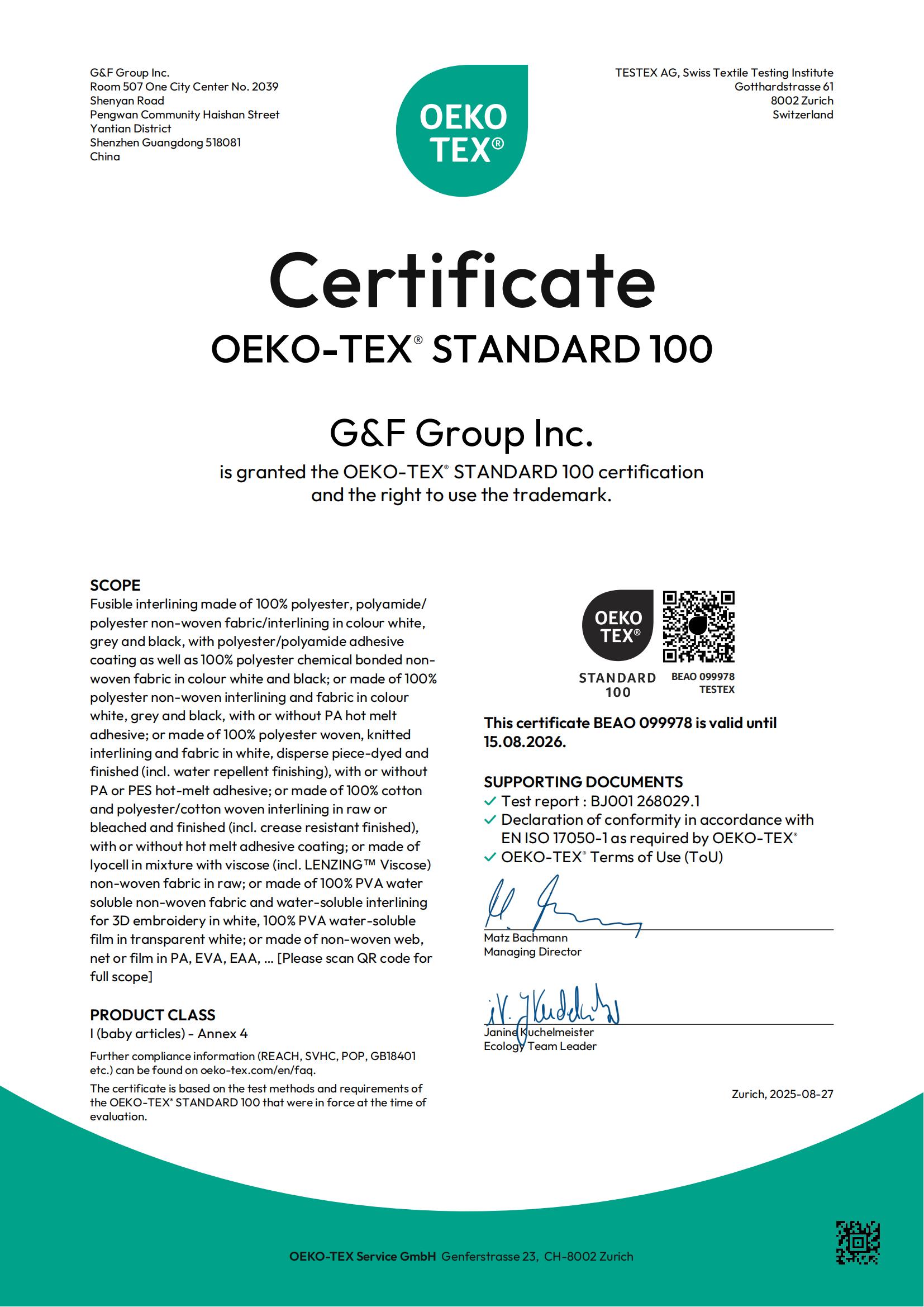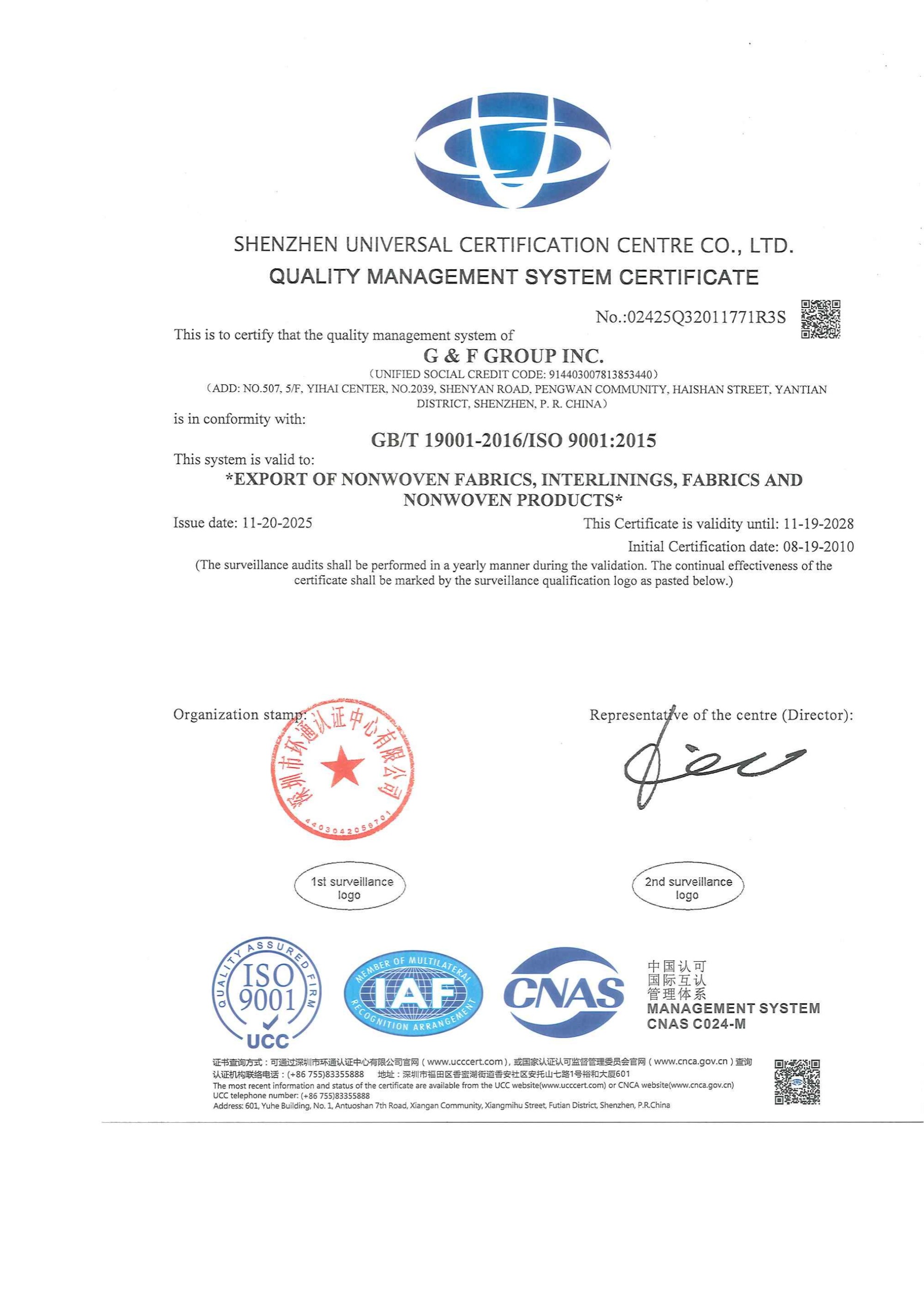Quality is the life of an enterprise. G&F always regards quality control as the company's first and most important rule. The company has not only passed the ISO9001:2015 quality management system. But also its products fully follow Oeko-Tex standards. We can provide various qualified products according to customer requirements. Product inspection certificate.